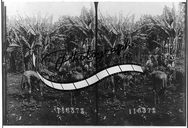 Women bending over in garden,men with staffs,1909,West Africa