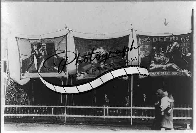 Midway of carnival showing 3 sideshow billboards