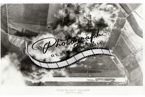 Summary: Leaving the target - B-17 bomber in fg; burning city in bg - Oct. 10.