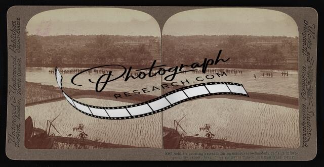 Soldiers crossing a stream during maneuvers--flooded rice fields in foreground--