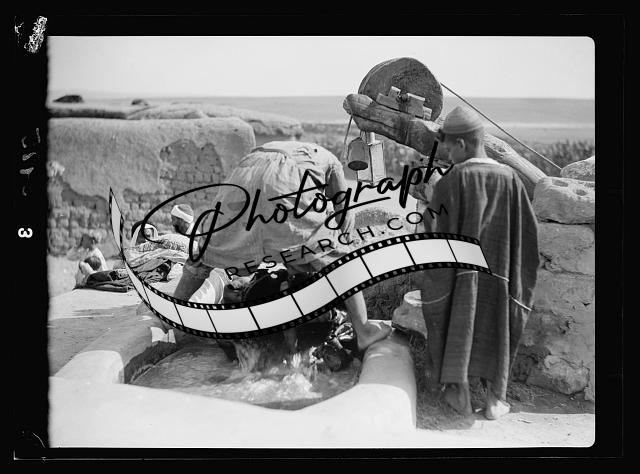 Drawing water by camel,cow power,Shafelah country,Middle East,American Colony,2