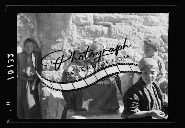 Women of Bethlehem grinding in courtyard before their home,West Bank,Middle East