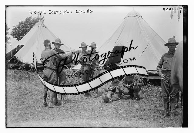 Signal Corps,Men dancing,tents,musical instruments,Bain News Service