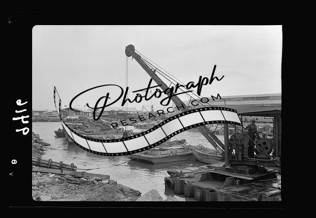 Title: Tel Aviv Harbour. A busy scene, loading lighters with orange boxes