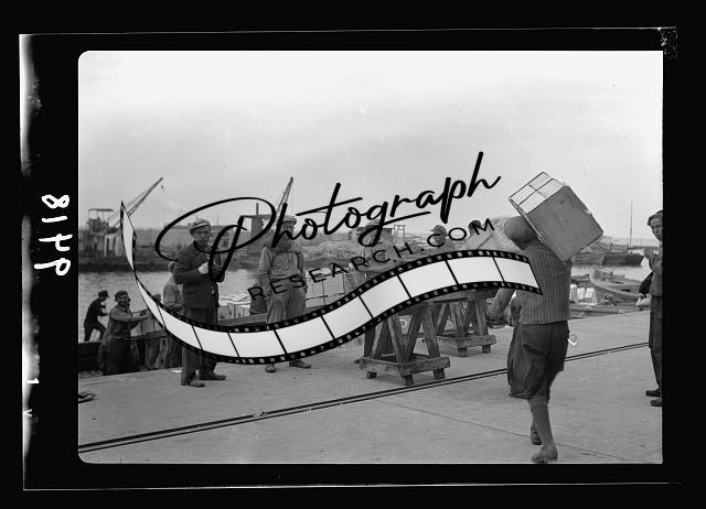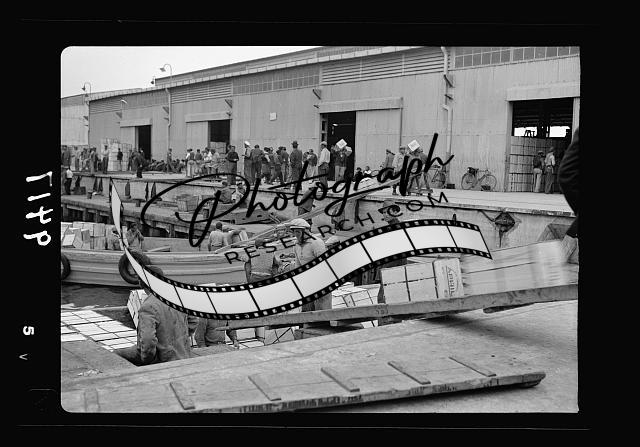 Title: Tel Aviv Harbour. A busy scene, loading lighters with orange boxes