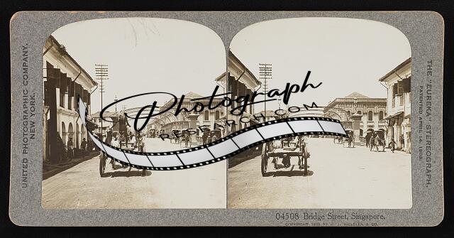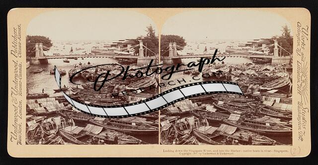 Looking down the Singapore river, and into the harbor--native boats in river--Si