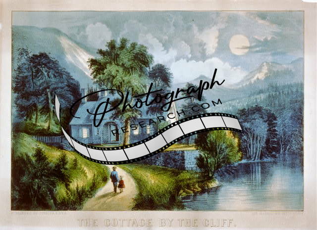 The Cottage by the Cliff,1856-1907,Currier & Ives photo,Moonlight,Mountains