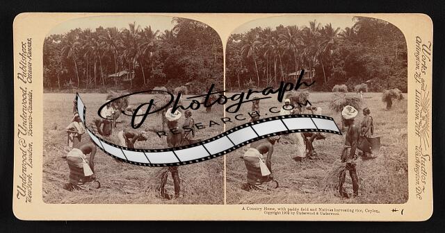 A country home, with paddy field and natives harvesting rice, Ceylon