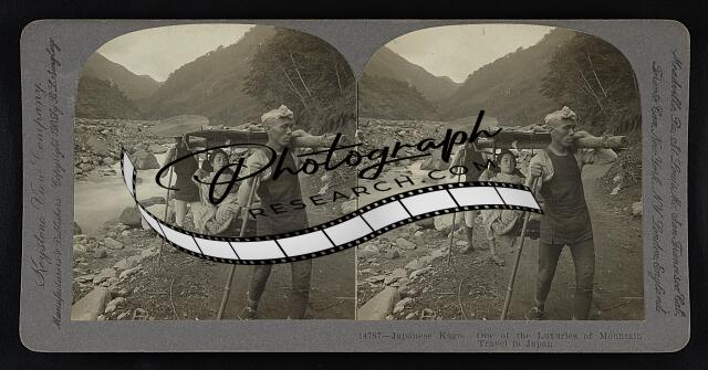 Coolies bearing a traveler in a kago chair through the mountains, Japan