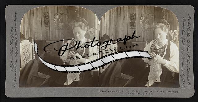 Telemarken girl in national costume making Hardanger embroidery, Norway