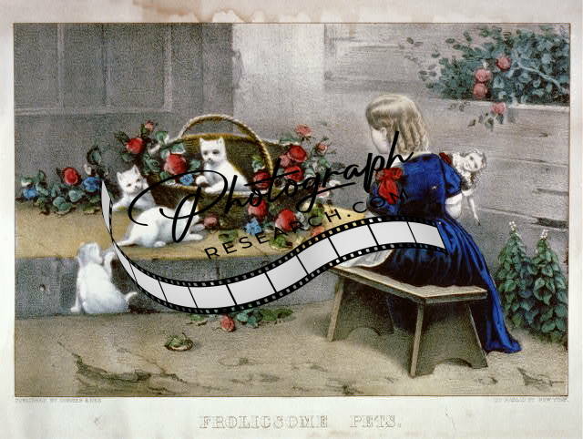 Frolicsome pets,1856-1907,Currier & Ives,Photo,small girl holding doll,kittens