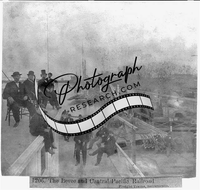 Levee,Central Pacific Railroad,Freight Trains,Sacramento,People resting,CA,1866