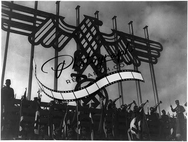 Nuremberg, Germany, 1933 - Nazi Party rally: trumpeters and color guard beneath huge swastika