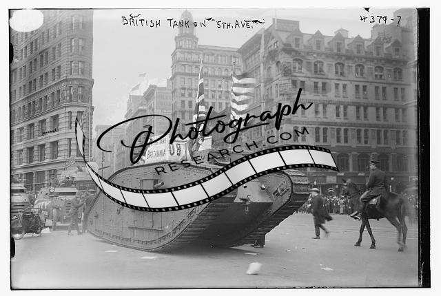 British tank on 5th Avenue,military,Bain News Service,buildings,man on horseback