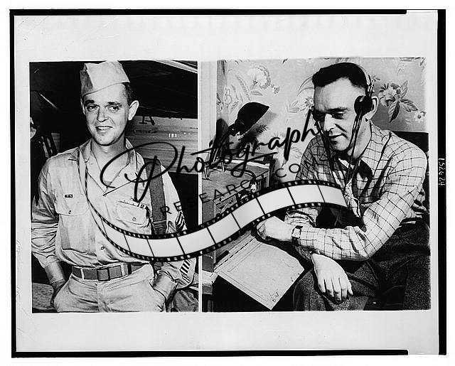 Message stirred nation eight years ago, Two photographs of Irving Strobing, head prisoner after Corregidor, one in uniform half-length, facing front and the other seated, listening to radio with headphones.