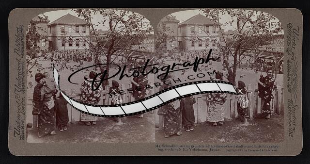 Schoolhouse and grounds with vine-covered shelter and little folks playing, (loo
