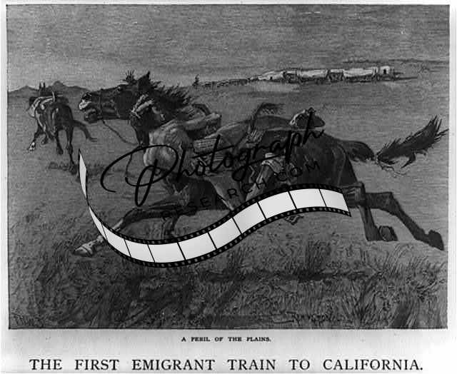 Indians circling wagon train,bodies shielded by horses,1st Emigrant Train to CA