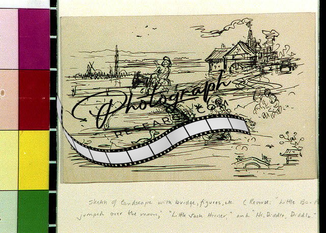 Landscape with bridge,figures,Thomas Nast,1860-1902,Nursery Rhyme,Horseback