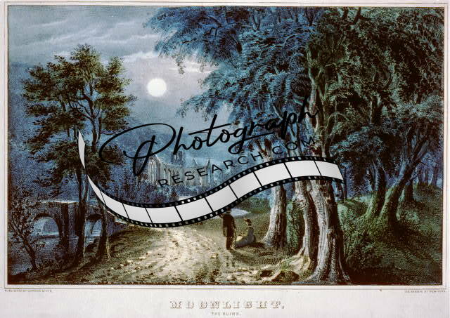 Moonlight: the ruins,Currier & Ives,1856-1907,couple,bridge,moon,trees
