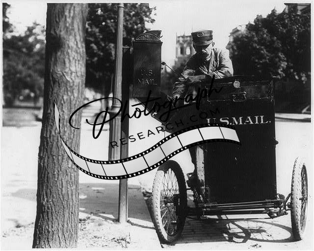 Motorcycle postman,collecting mail from mailbox,1912