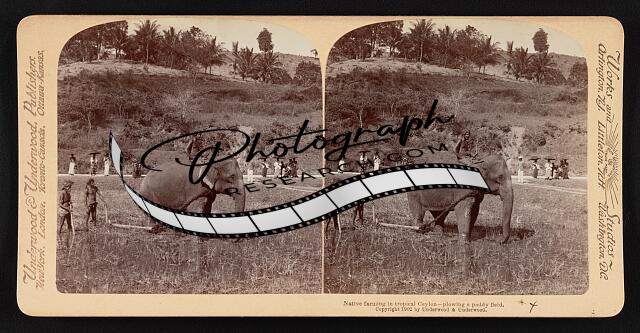 Tame elephants, the mammoth beasts of labor and travel, in tropical Ceylon--near