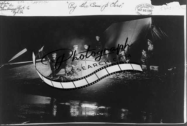 'By the camp fire',group of fishermen relaxing around camp fire,tent,c1897