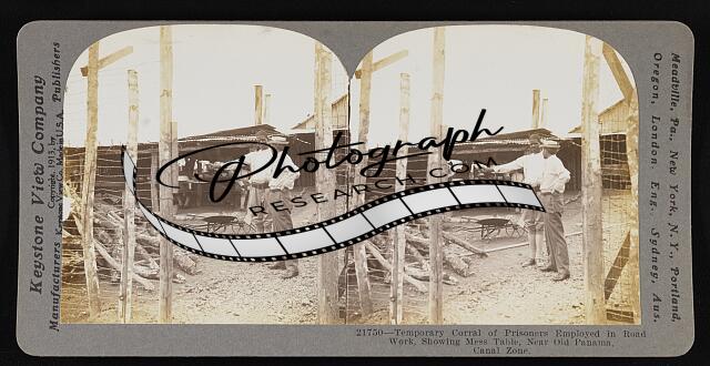 Temporary corral of the prisoners employed in road work, showing mess table, nea