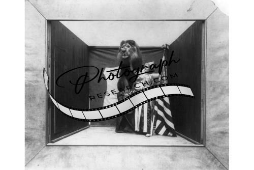 Woman w/ stars,eagle,costume,holding US Flag,touching tame lion under neck,c1901