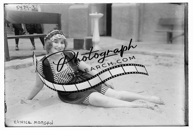 Eunice Morgan,sand,bathing suits,headband,bench,women,portrait,Bain News Service