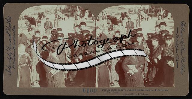 Patriotic school boys wearing soldier caps on the streets of Tokyo, Japan