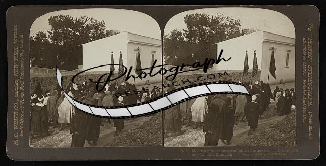 Moorish procession escorting a returned pilgrim from Mecca into Tangier, Morocco