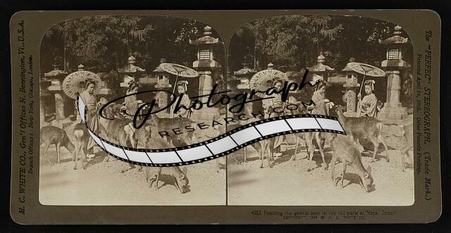 Title: A tame deer resting in the spreading roots of an old cedar tree, Nara Park, Japan