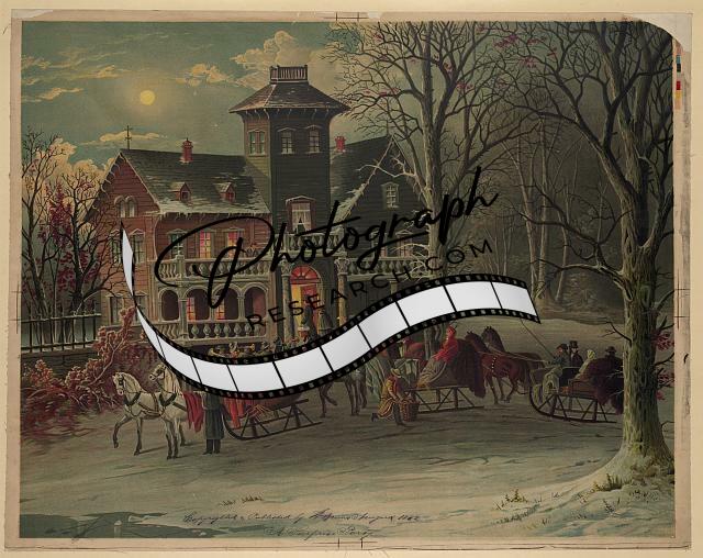A Surprise party,c1882,horse drawn sleighs,people,house,trees