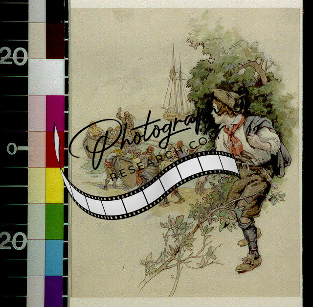 Jim Hawkins watching pirates coming ashore in canoes,George Edmund Varian,1918?