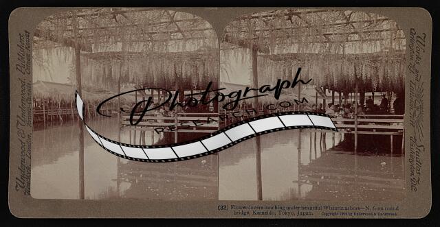 Flower-lovers lunching under beautiful wistaria arbors--n. from round bridge, Kameido, Tokyo, Japan