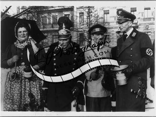 3 men and 1 woman representing German Air Defense Assoc. collecting money for charity Potsdam Platz, in Nazi uniform, is Gen. von Schroder