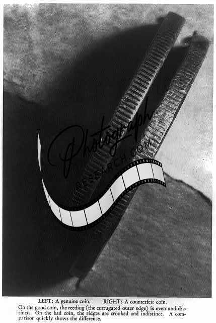 Photo of Left: A genuine coin. Right: A counterfeit coin, 1940s
