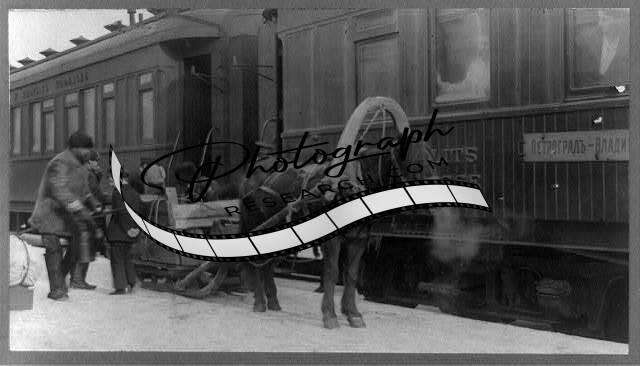 Getting,wood,heat cars,railroad station,locomotives,sleighs,Siberia,Russia,c1918