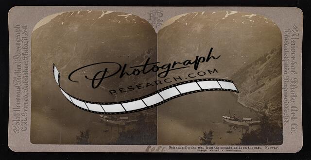 Steamer "Mira" at anchor in the deep Geirangerfjord at Marok, under the mountain
