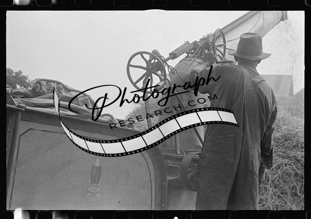 Adjusting straw stocker on grain separator,central Ohio,OH,Summer 1938,FSA,3