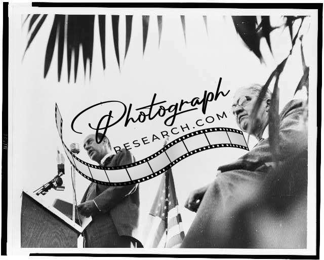 Title: [Adlai E. Stevenson, half-length portrait, facing left, standing at podium, speaking to crowd, at Yale University, New Haven, Conn.]