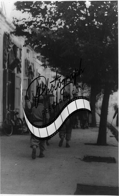 Street view of Kabul,Afghanistan: rear view of 3 soldiers walking,bicycle,1955