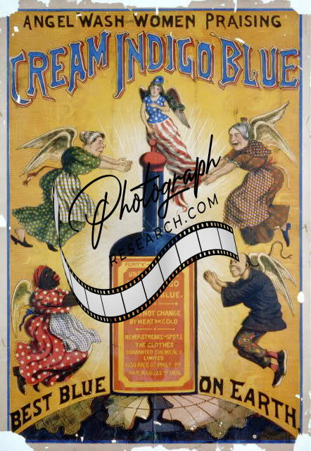 Cream Indigo Blue,1870s,launderers with wings flutter around bottle,Miss Liberty