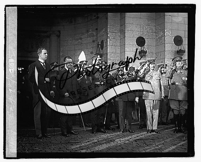 Admiral Kato & Major General K. Tanaka,group saluting outside building,1921