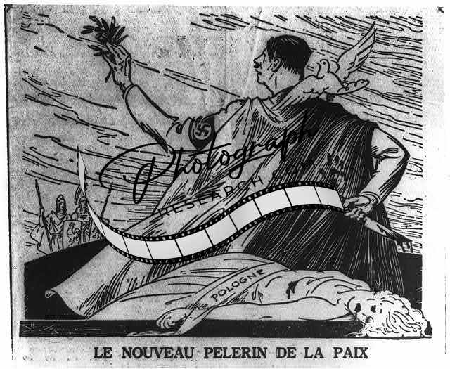 Adolf Hitler, 1889-1945 - cartoon caricatures from French publications, 1935-1939 - "Le nouveau pelerin de la paix", holding up olive branch while hiding corpse of Poland