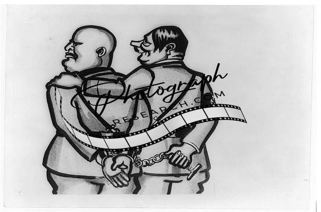 Adolf Hitler, 1889-1945 - cartoon caricatures from French publications, 1935-1939 - with arm around manacled Mussolini