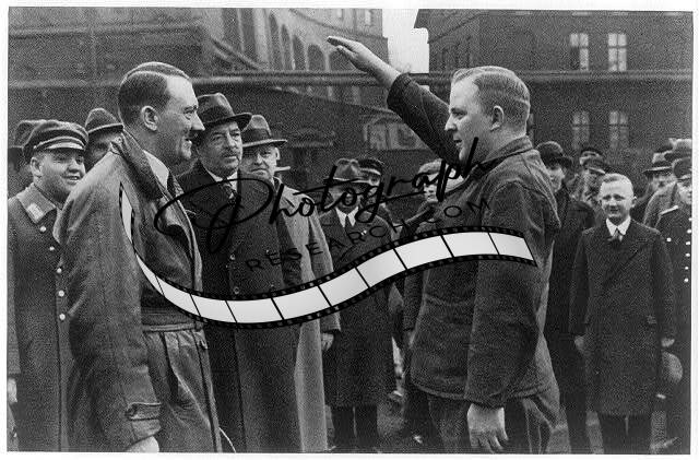 Adolf Hitler, 1889-1945; worker saluting him during inspection of factory