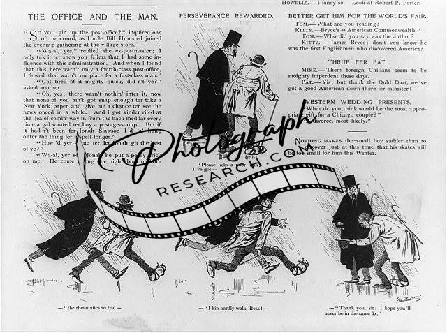 Perseverance rewarded,cartoon,1891,beggar running after man,boss,rheumatics
