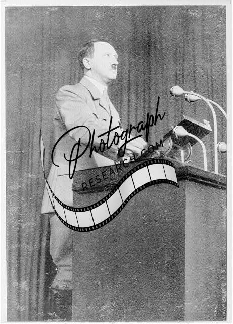 Adolf Hitler, three-quarters length, standing, facing right, at podium. March 1936