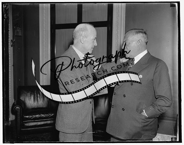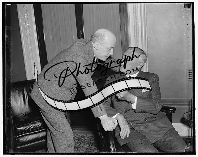 Title: Advice from a veteran to a rookie. Washington, D.C., April 6. Senator A. Harry Moore, of New Jersey, gives a bit of advice to Rep. Edward Leo O'Neill, rookie congressman from the same state. Rep. O'Neill is one of the baby members of the 75th congress, 4/6/1937